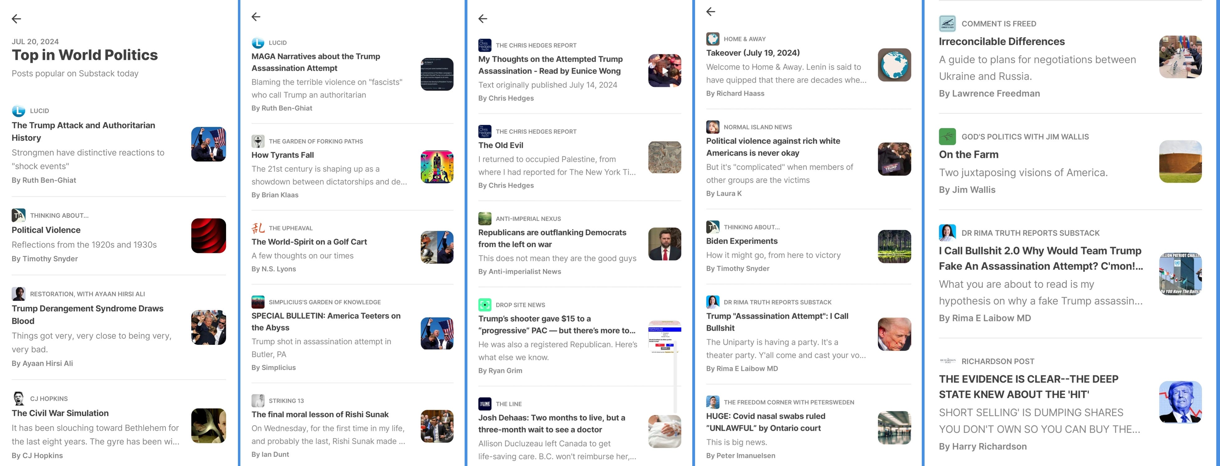Similarly, my world politics section for July 20th featured 23 posts—14 of which were on US politics (11 specifically on the assassination attempt). On a related note, Kevin McSpadden, who writes A6 - Where the world happens, wrote that it’s “tough out there for any American trying to get news outside of the election. Gotta turn to my trusted British and Asian press it seems.” More of such in the coming week, I bet, with Joe Biden dropping out of the 2024 presidential election.
