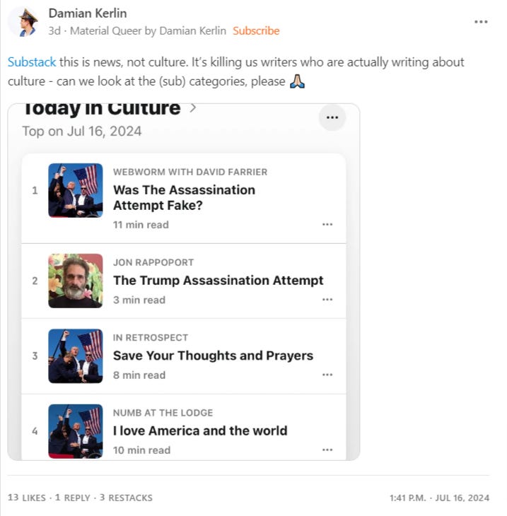 Queer culture writer Damian Kerlin noted that the culture section on Substack is not at all about culture, with the accompanying screenshot. Another Substacker Valerie Estrina wrote, “The culture section of Substack is so chaotic you’ll have five trending posts on the death of democracy and political assassination and a ‘my tits are out cause it’s brat summer’ essay squeezed right in between.”