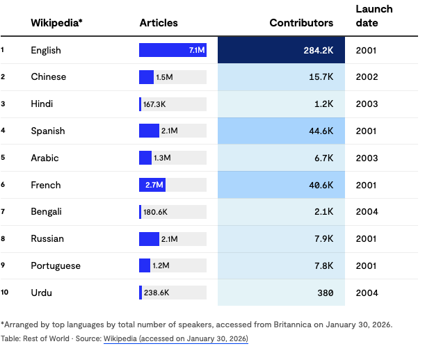 Wikipedias in the world’s most widely spoken languages, from the second story above, courtesy of Rest of World with data from Wikipedia (January 30, 2026).